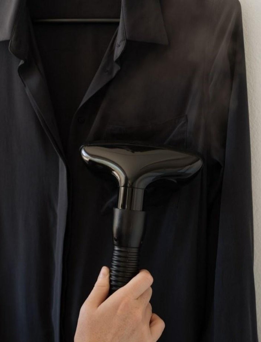 The hot steam from a home-steamer lifts the textile fibers – instead of pressing them down like the iron – and makes them swell and regain their natural shape. Steaming is similar to airing clothes. The hot steam removes signs of a garment ever being worn, such as odors, shallow dirt and bacteria.
